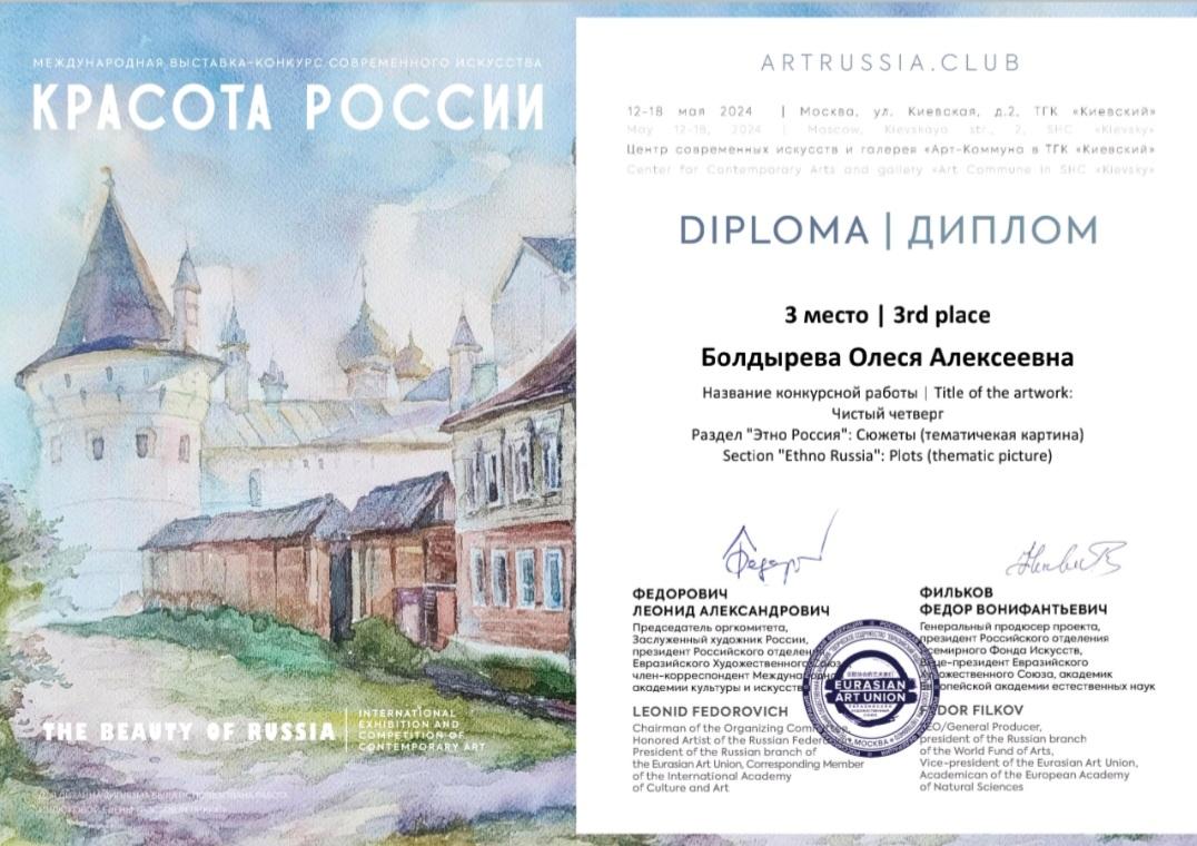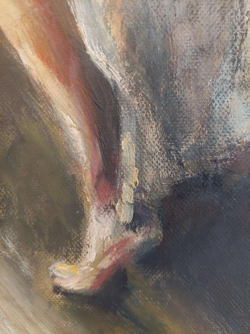 «Чистый четверг» — живописная работа 2024 года, масло на холсте, размер 90×80 см. Интерьер деревенской бани передан через детали: веники на стене и в ведре, деревянная скамья, стол с яблоками, крынкой и чашей. В центре композиции — две девушки, смотрящие в окно, где горит тёплый закат. Свет заката мягко обволакивает сцену, подчёркивая текстуру холста и плотность масляных мазков. Картина наполнена символикой очищения и возрождения — мотивы ритуала, покоя и природной простоты делают работу актуальной для интерьерной экспозиции в стиле рустик, этно, кантри или современное классическое пространство. Произведение будет интересно коллекционерам живописи, любителям бытовых жанров и тематических сюжетов, связанных с традициями русской деревни.